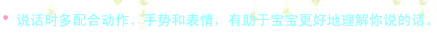 要及时回应宝宝的任何声音、手势和表情。虽然 1 岁大的时候宝宝能说的词很少,发音也不准,不过只要他在努力地发声,那就是在练习讲话,你越是把他这些练习当成真正的讲话,回应得越多,就越能激发他的交流欲望。